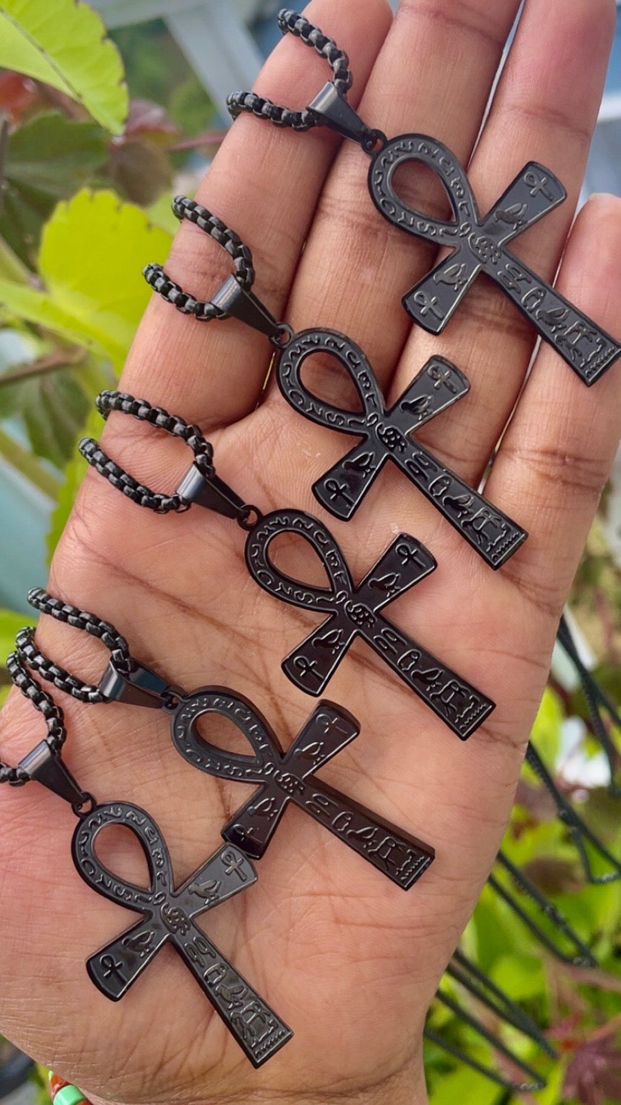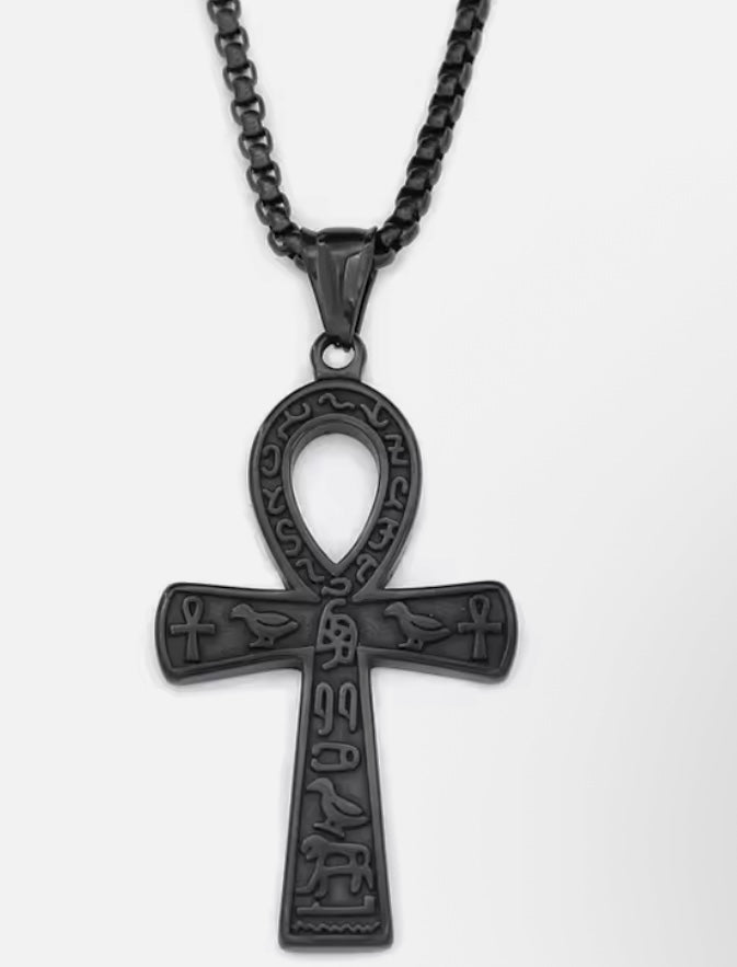 Crafted in matte black stainless steel & etched with ancient hieroglyphs, this ankh serves as a timeless portal to your ancestral roots.
