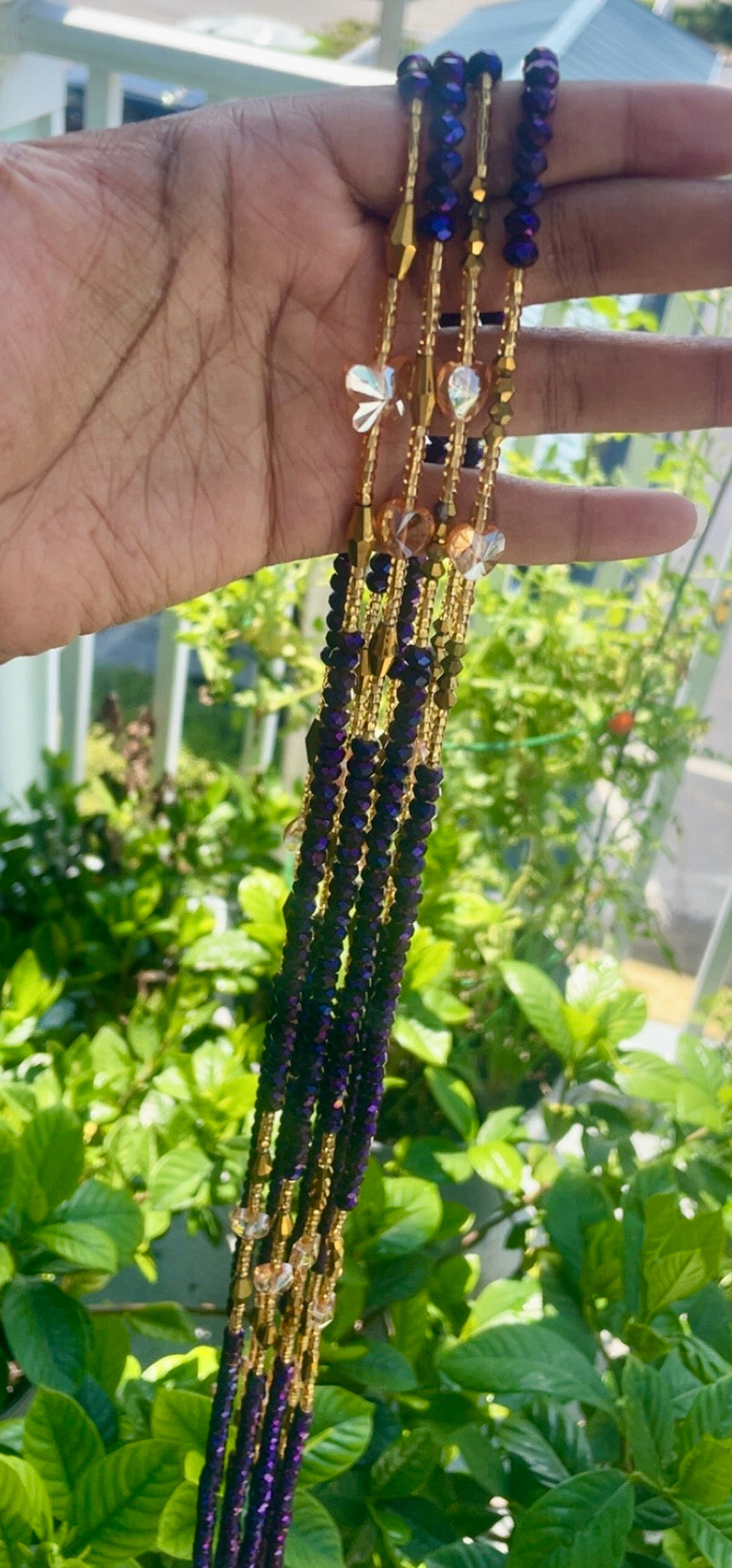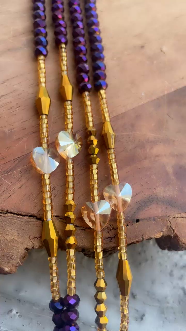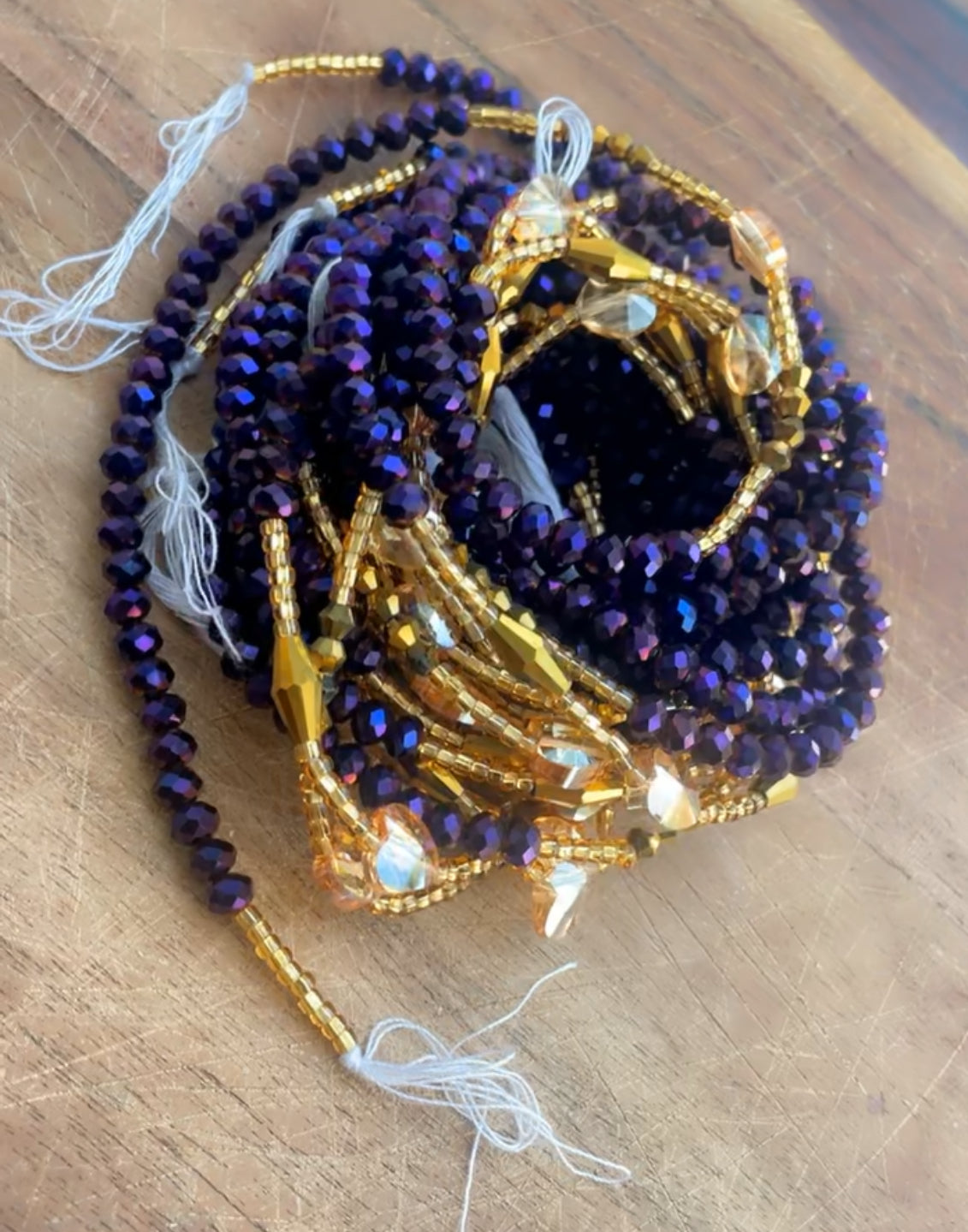 Royal Eclipse waistbeads glow with the deep mystery of midnight purple, representing intuition, royalty, & spiritual power. Paired with radiant gold, they embody wealth, divine protection, & ancestral majesty. The crystal accents shimmer like stars against the night sky, symbolizing clarity, love, & illumination. This strand is a luxurious adornment of both shadow & light—honoring the goddess who reigns in her fullness, magnetic & unstoppable. 🌌💜💫